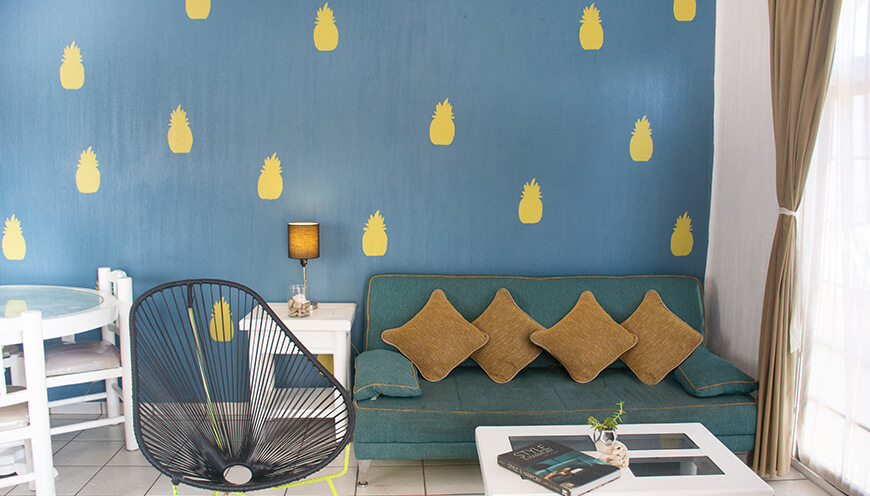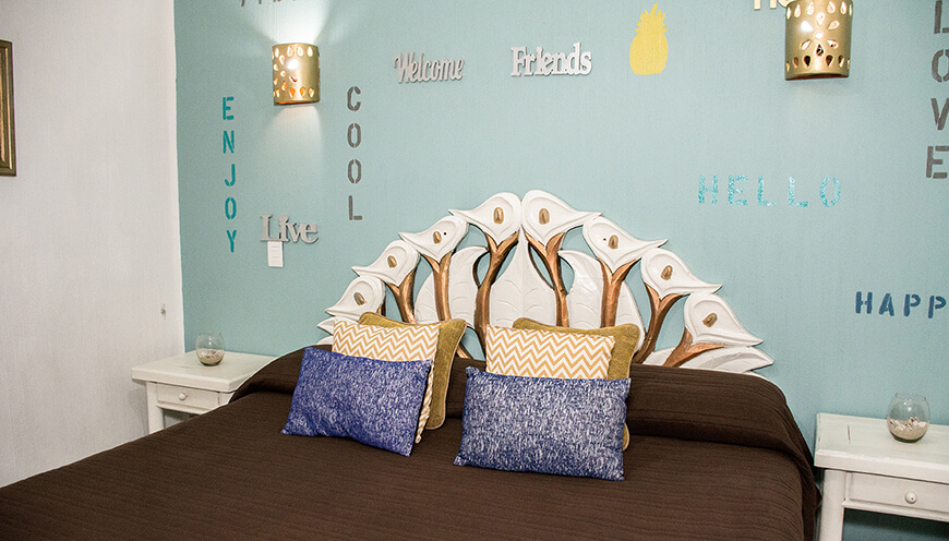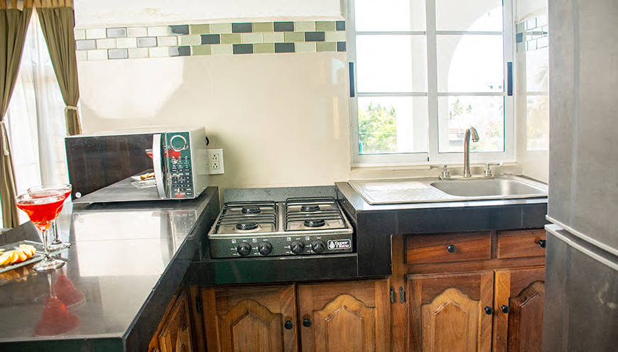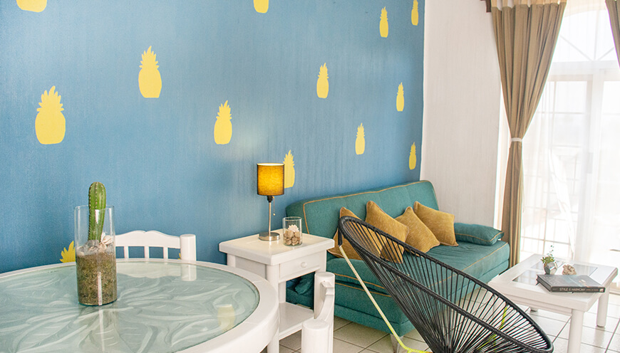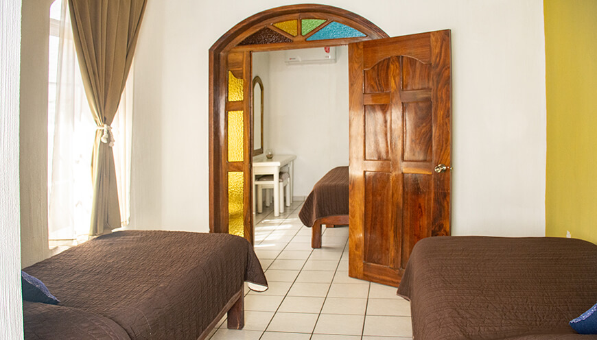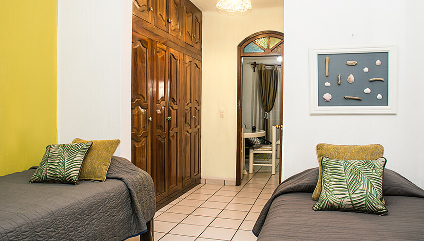 Hermoso diseño mexicano tropical, amplia, luminosa y comoda en segundo piso. Bungalow con capacidad de 4 a 6 personas, dos camas individuales, cocina equipada, comedor, sala, tv con cable, WIFI y balcón con vista a la alberca.